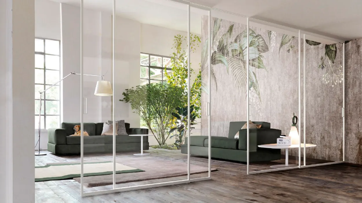 La porte coulissante suspendue Zeus divise les pièces avec un style très moderne, avec un profilé périmétral carré en aluminium, disponible en différentes finitions. Ce profil très minimaliste caractérise la porte, lui donnant de l'importance et en la faisant ainsi le protagoniste de l'environnement. Le verre est disponible en plusieurs versions : transparent, satiné, fumé, bronzé, réfléchissant, laqué, avec tissu ou imprimé. De plus, il est possible d'insérer des traverses décoratives qui caractérisent davantage la porte, entre les modèles du catalogue Doal et les solutions personnalisées conçues par le designer.