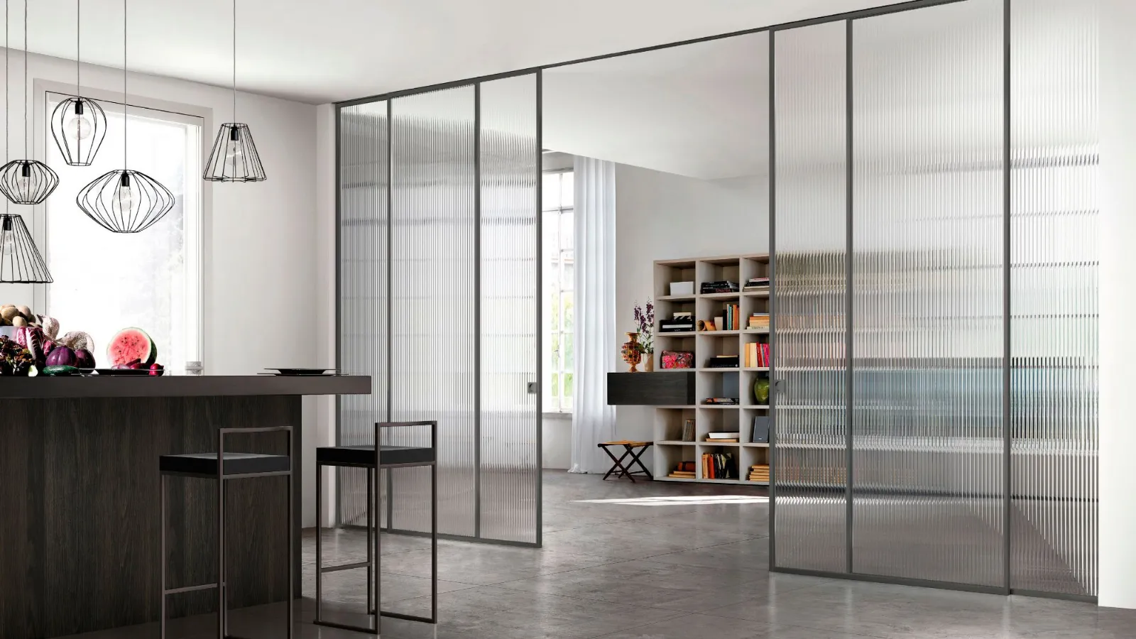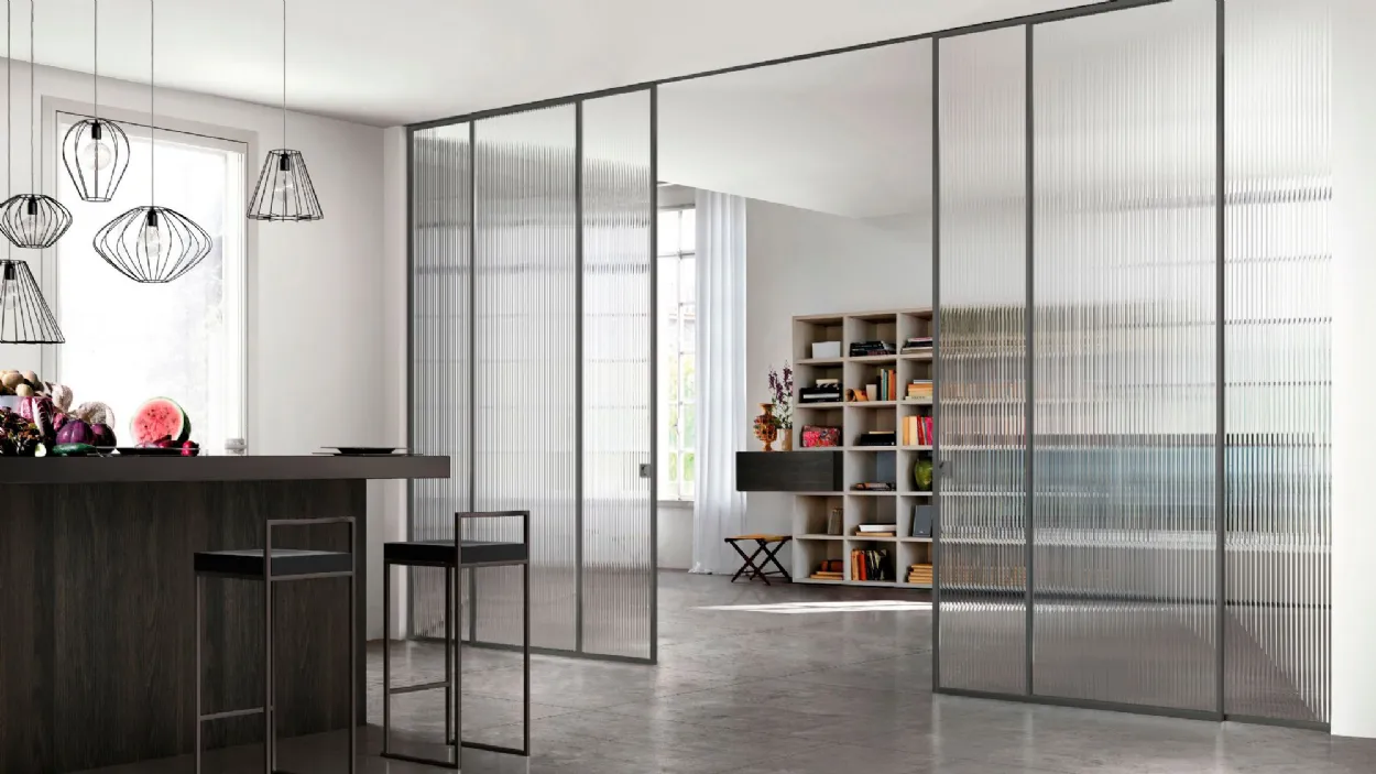 La Zeus coulissante suspendue est également idéale pour fermer un espace garde-manger dans la cuisine, qui devient ainsi un élément d'ameublement grâce à l'utilisation de portes coulissantes en verre qui cachent l'intérieur sans le recouvrir, comme dans le cas du verre Pixel de cette image. De cette façon, un garde-manger parfaitement adapté, élégant et fonctionnel est créé.